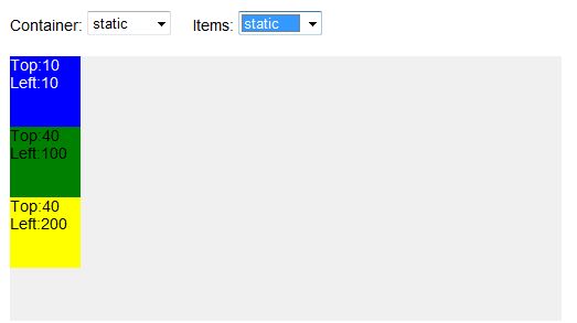 The colored items have a width and a height of 64 pixels. The container has no properties of position, so it appears always after the previous element in the page.